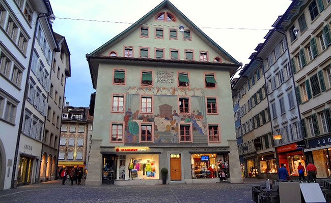 Tọa lạc bên bờ sông Reuss, khu phố cổ vhiện diện với những ngôi nhà được trang trí đẹp mắt miêu tả những câu truyện cổ tích trong Kinh thánh.