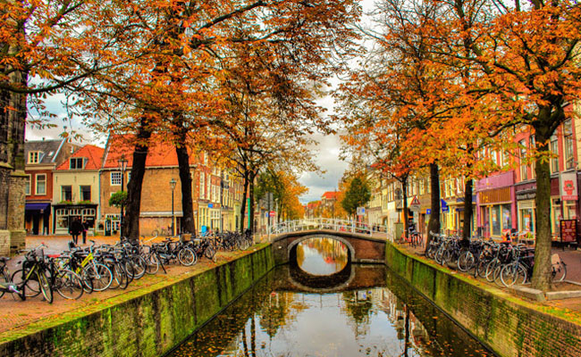 Thời tiết Hà Lan vào thu mát mẻ hơn, những dòng kênh in bóng những chiếc lá đang chuyển sắc.