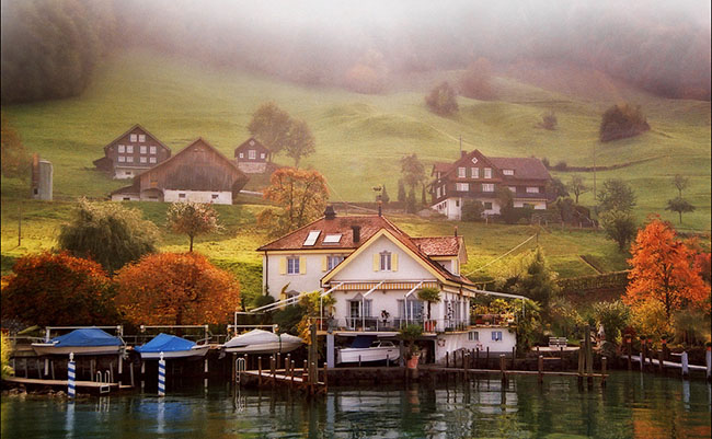 Thụy Sĩ – đất nước xinh đẹp, nổi tiếng với sự thanh bình của vo số tòa lâu đài tọa lạc nằm sát mép hồ, hay từng dãy núi cao hung vĩ soi bóng trên mặt nước, trên những dòng sông xanh thơ mộng. Mùa thu ở Thụy Sĩ nổi bật với hình ảnh những ngôi nhà nằm xen kẽ trong cách đồng nho.