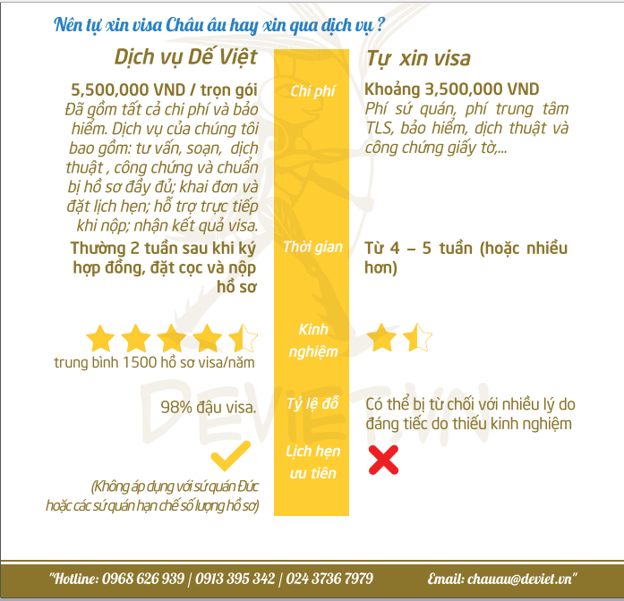 Ưu điểm : Hình thức làm visa trọn gói của Dế Việt có giá 5.500.000 VNĐ bao gồm tất cả chi phí và bảo hiểm ( bao gồm : tư vấn hồ sơ, soạn hồ sơ, dịch thuật, công chứng và chuẩn bị hồ sơ nộp cho TLS Contact …) .