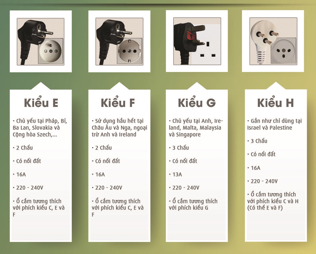 - Kiểu F: Loại ổ cắm này được sử dụng nhiều tại châu Âu, bao gồm Đức, Áo, Hà Lan, Thụy Điển, Na Uy, Phần Lan, Bồ Đào Nha, Tây Ban Nha và khu vực Đông Âu. Phích cắm này được mệnh danh là loại ổ cắm vô cùng an toàn cho người sử dụng.