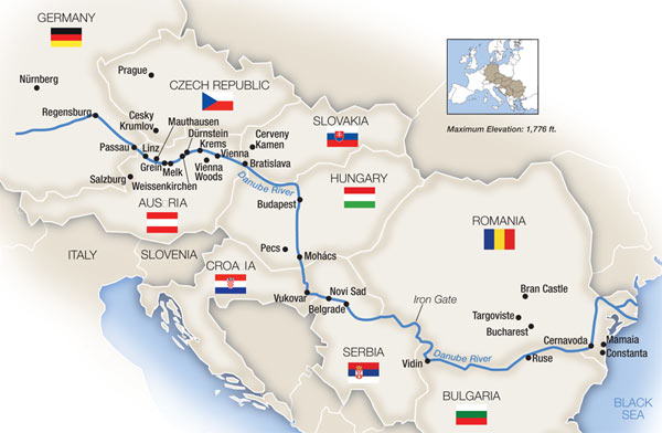 Sông Danube bắt nguồn từ Rừng Đen của Đức, và chảy theo hướng đông nam qua trung tâm và phía đông châu Âu đến Biển Đen.