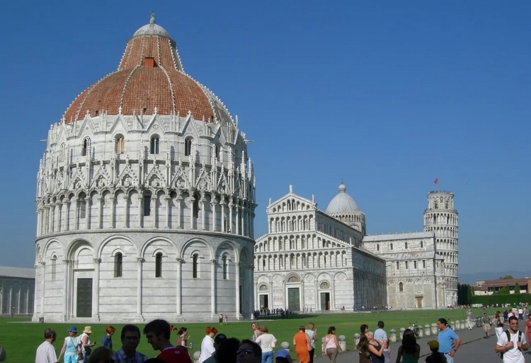 - Tòa nhà giáo hội Baptisteri (chụp hình bên ngoài) được xây dựng vào năm 1152 gần Duomo di Pisa. Baptistery được thiết kế bởi Diotisalvi, có chữ ký có thể được đọc trên hai trụ bên trong tòa nhà.