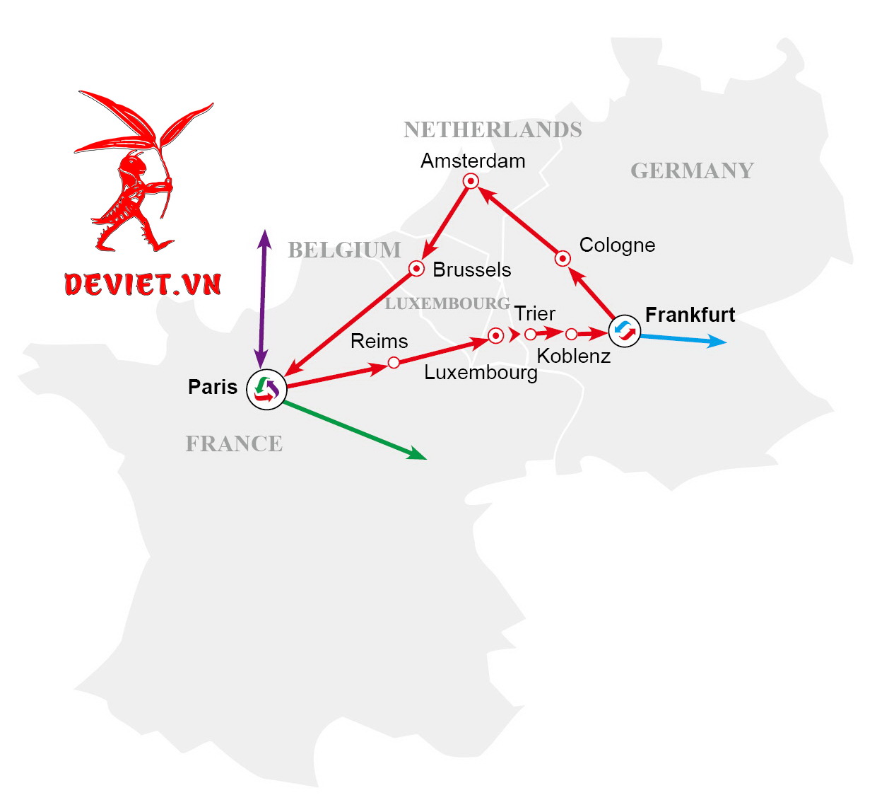 Những điểm thăm quan chính: 5 quốc gia và 10 thành phố. Đức (Frankfurt, Bonn, Cologne, Trier, Koblenz), Hà Lan (Amsterdam, Zaanse Schans), Bỉ (Brussels), Pháp (Paris, Versailles, Reims), Luxembourg.