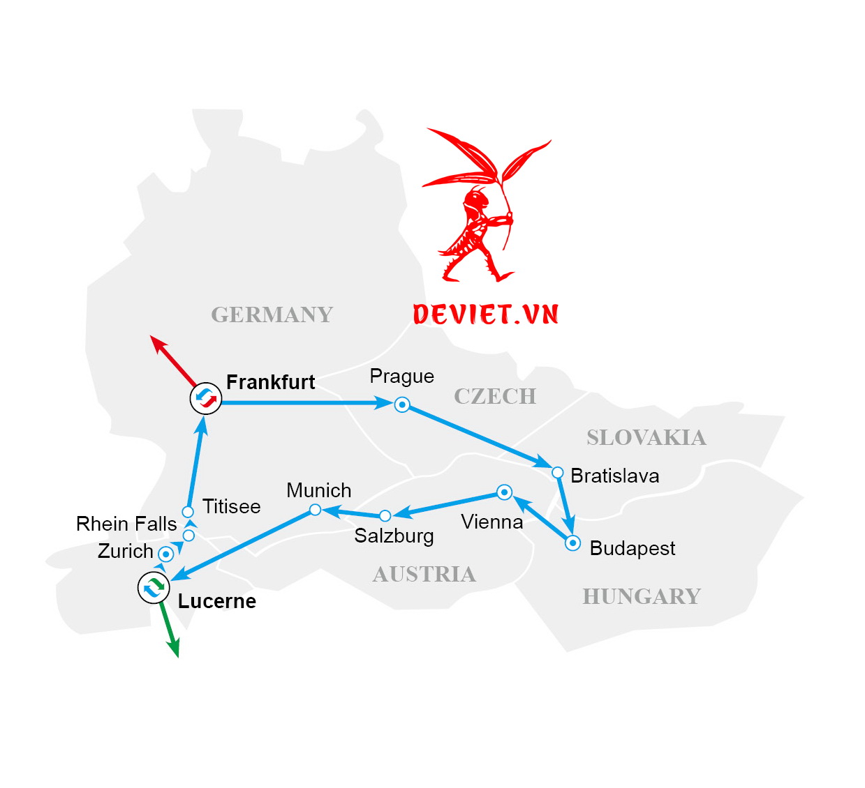 Cùng theo dõi trải nghiệm du lịch châu Âu cùng những du khách của Dế Việt qua 6 quốc gia và 10 thành phố. Đức (Frankfurt, thác Rhein, hồ Titisee), Séc (Prague = Praha), Slovakia (Bratislava), Hungary (Budapest), Áo (Vienna, Salzburg), Thụy Sỹ (Lucerne, Zurich). Xem chi tiết hành trình tại đây.